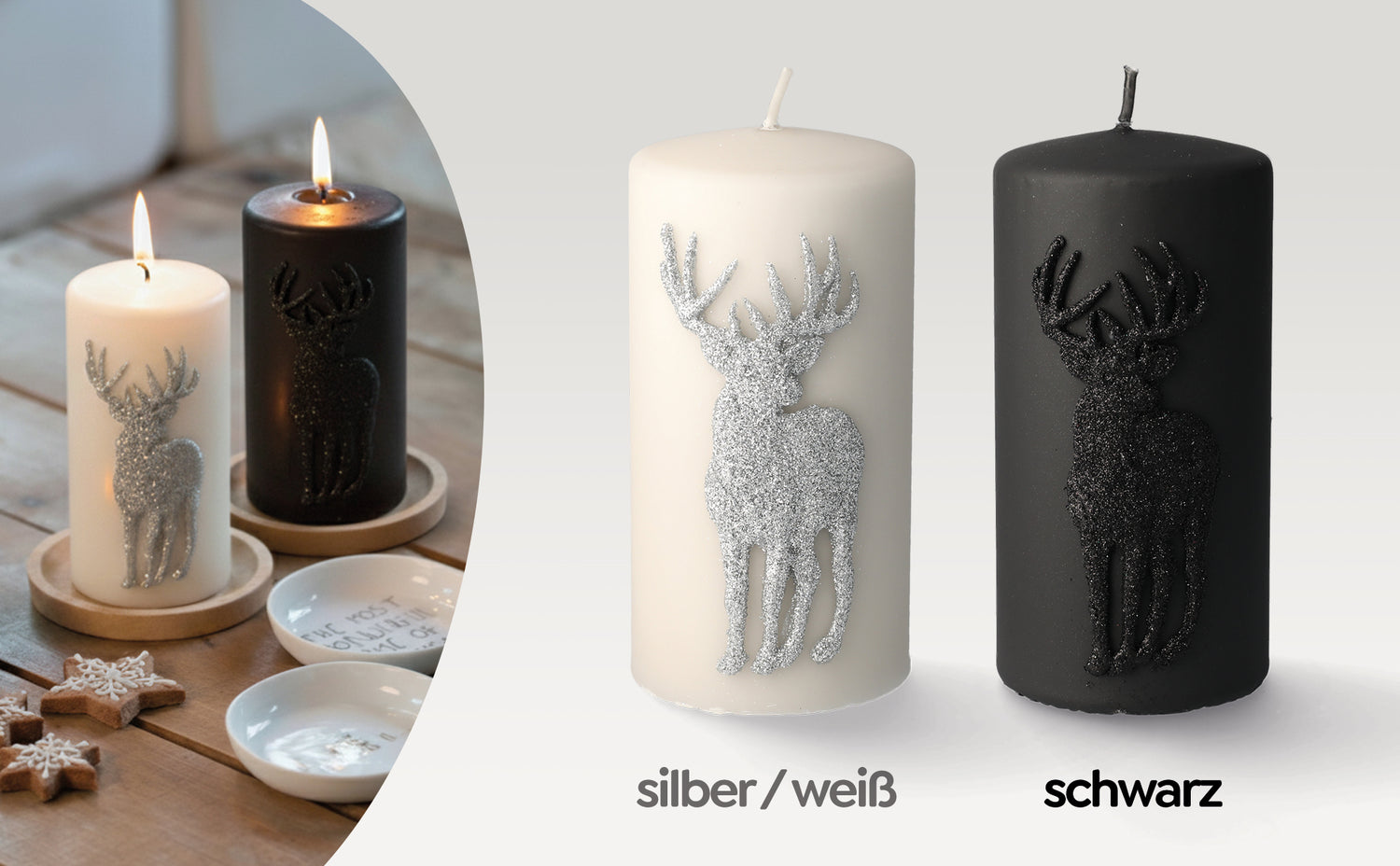 Stumpenkerze Rensdyr mit Hirsch-Motiv - perfekt für deinen Adventskrasnz oder als stilvolle Weihnachts- und Winterkerze. Auch als Hingucker auf Tisch oder als Geschenk für deine Mama oder beste Freundin.