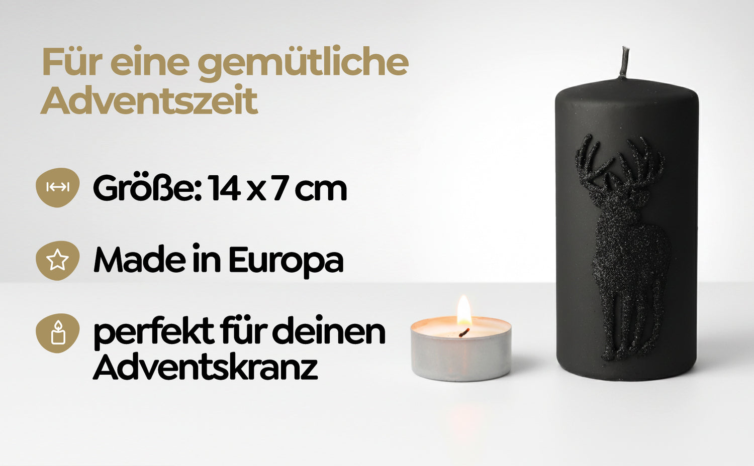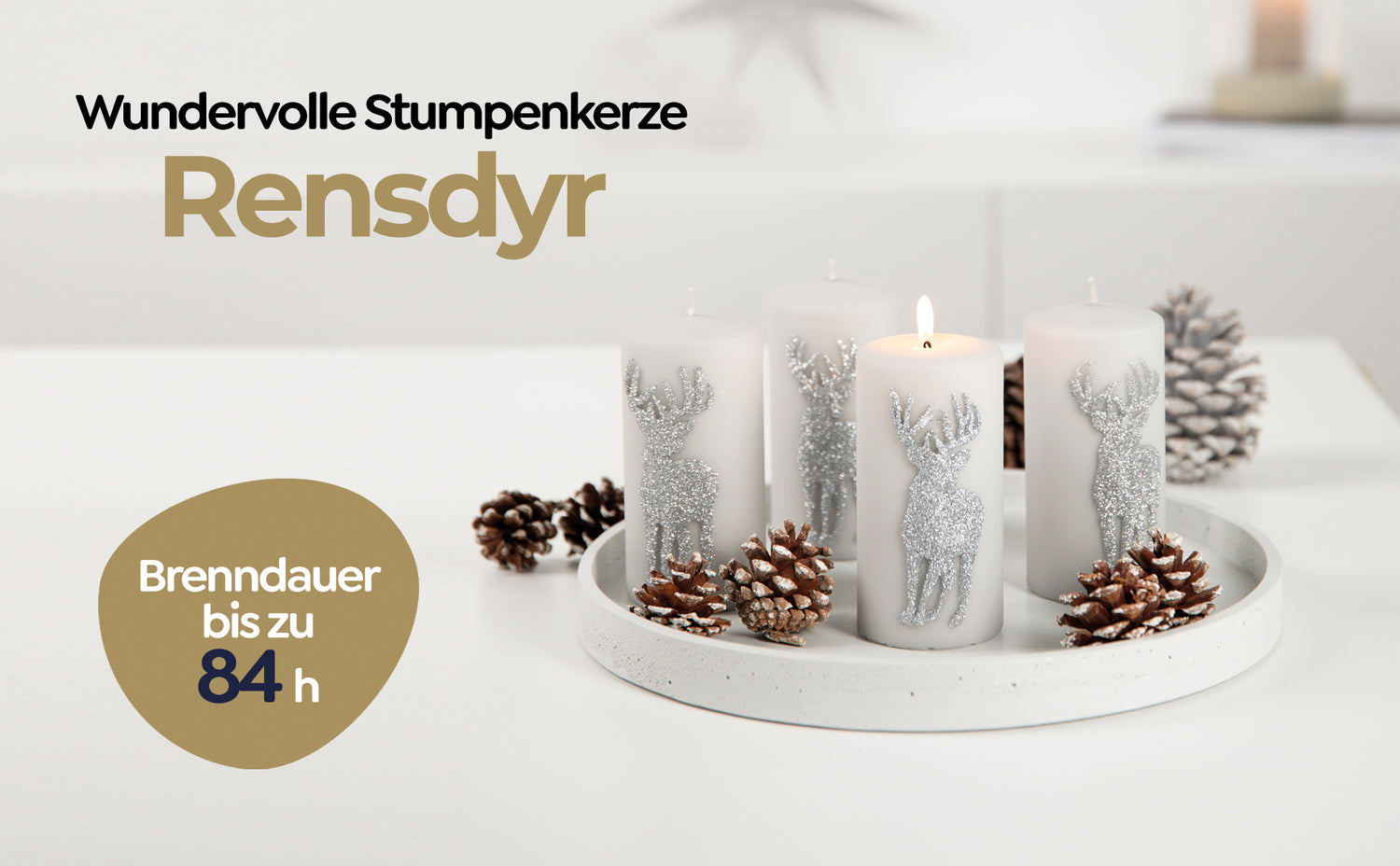 Die Stumpenkerze Rensdyr (7×14 cm) vereint hochwertiges europäisches Handwerk mit elegantem Design aus Deutschland. Ideal als Adventskerze im Adventskranz oder als stilvolles Highlight in deiner winterlichen Dekoration.